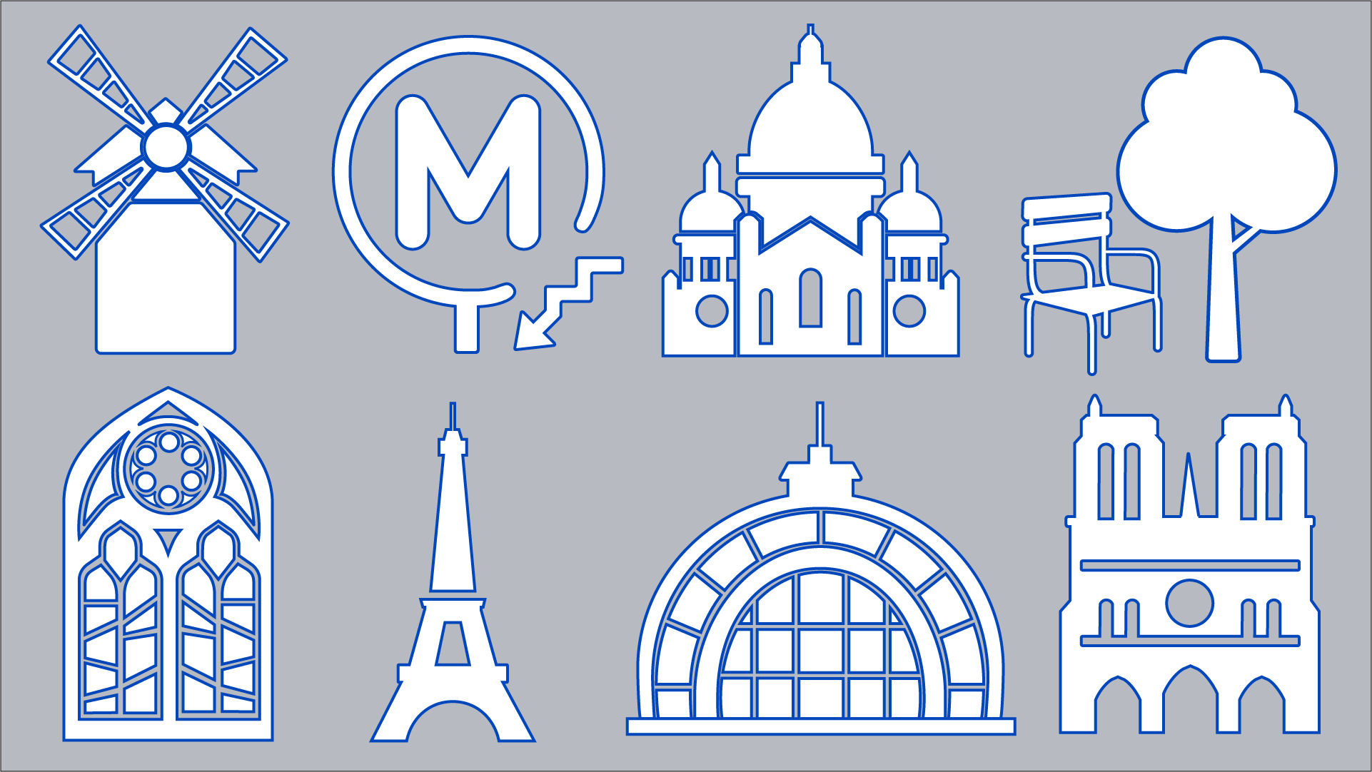 For this project, I was tasked with creating twenty-one custom icons of various points of interest throughout Paris to pair with Nationwide’s series of 3D-generated fly-through videos. I built the iconography using Illustrator, making sure to keep the visual aesthetic of each icon consistent with the brands guidelines.